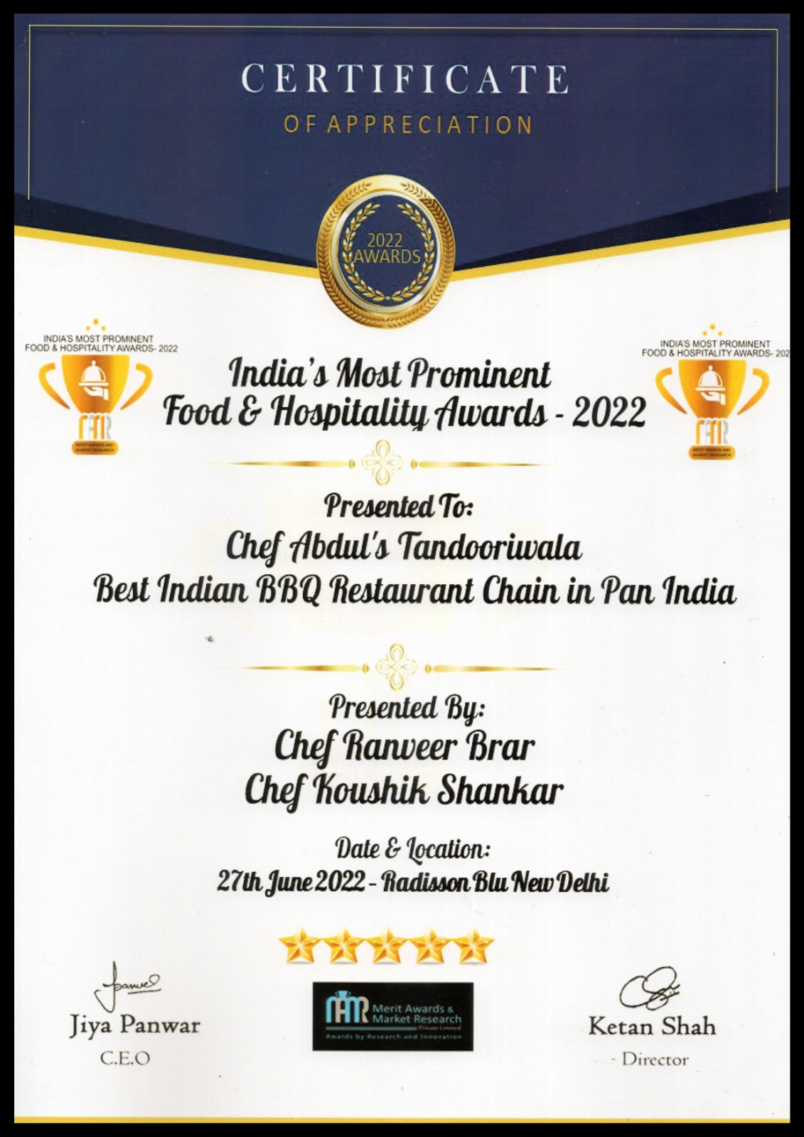 Master Chef Shajahan M Abdul (Chef Abdul) has internationalized the Indian taste of succulence and spices in the food he serves in his restaurants. Chef Abdul firmly created the plebeian village tandoor cooking into a royal mode of his innovation.